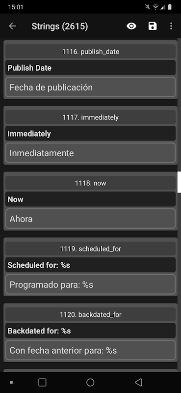 - Editor string dengan segala hal yang perlu diketahui pengembang tentang string, termasuk kode fitur dan teks aslinya.