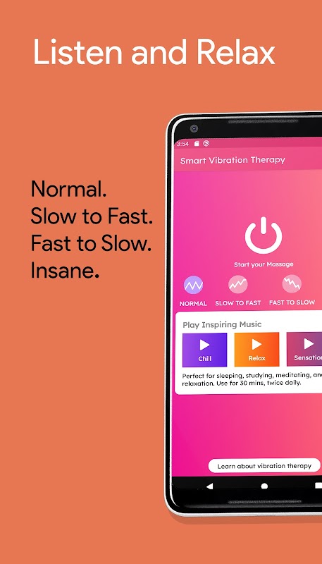 This app is a strong, powerful and awesome vibrator and vibration relaxing app which lets you to relax and enjoy four unique types of massage speeds and very nice unique and quick modes settings and also has an excellent, fast and amazing vibrator massage mode and our app also comes with unique four mode types which are simple and regular mode type, from to a fast to slow mode type, and also a low to fast mode type, and lastly a random insane vibrator massage mode type.