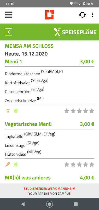 - Menu Mensa: Dari dapur langsung ke aplikasi Anda sendiri - sangat up-to-date! Fitur tambahan: Dengan StudiPlus²® Anda dapat menyaring menu di kantin di universitas Mannheim menurut berbagai kriteria (alergen, vegan, vegetarian, tanpa babi, dll.) Dan tentu saja juga mengevaluasinya secara langsung.