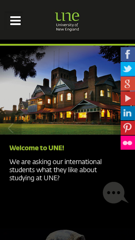• Links to the University of New England's International social media channels (Facebook, Twitter, YouTube, Flickr & more)