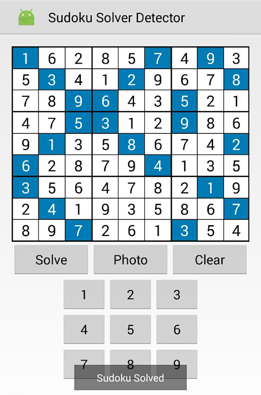 Aplikasi ini dapat memecahkan sudokus dimasukkan baik dengan tangan atau dengan memindai foto. Ini akan membiarkan Anda mengubah sudoku dipindai dan akan menunjukkan solusi jika salah satu ada. Hal ini cepat, ringan dan akurat! (Silakan gunakan foto yang baik)