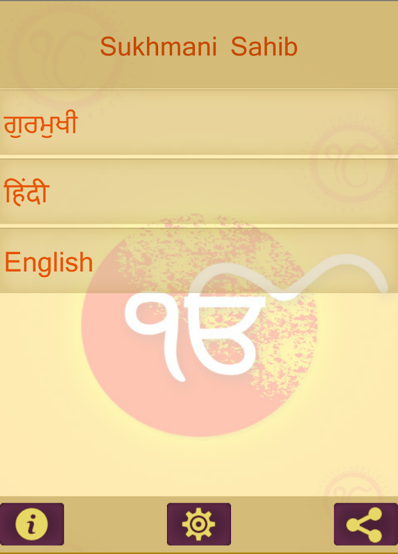 Aplikasi ini adalah aplikasi multibahasa dengan Sukhmani Sahib dalam bahasa Hindi, Punjabi (Gurmukhi) dan Script Bahasa Inggris. Script Bahasa Inggris juga berisi terjemahan.