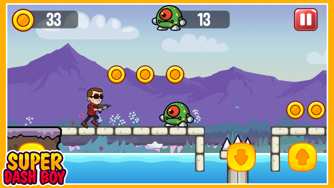 Super Dash Boy - Lari, lompat, dan tembak monster, hindari rintangan, kumpulkan poin, dan gunakan gadget.