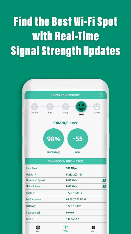 Pengukur Kekuatan Sinyal Wifi & Tes Kecepatan SuperWifi dapat Melihat kekuatan sinyal koneksi wifi Anda saat ini dan mendeteksi Kekuatan Sinyal WiFi di sekitar Anda secara real time.