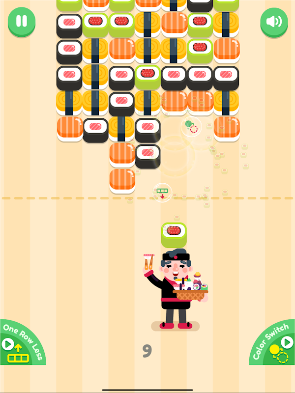 Tembak sushi dengan 3 warna atau lebih, Anda menang dan makan lebih banyak koin, semakin banyak koin, semakin Anda menjadi master sushi.