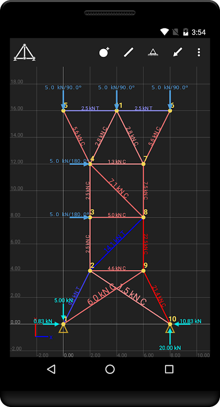 -Calculates gaya aksial semua anggota dan menampilkannya secara grafis.