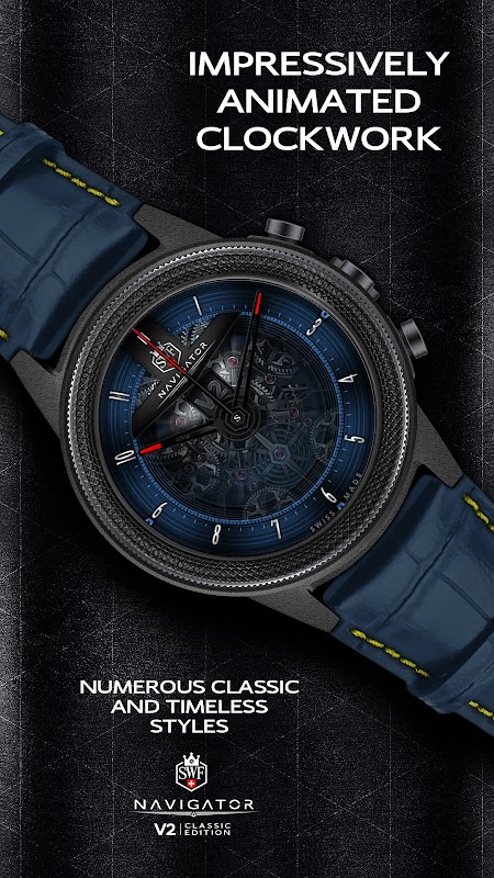 SWF Navigator V2 Classic analog watch face Seri PRO mengesankan dengan jarum jam animasi terperinci dan memungkinkan Anda membuat ribuan kombinasi berbeda dengan menggabungkan batas, bingkai, garis, angka, jarum, dan warna secara bebas. Seri PRO memungkinkan Anda mengonfigurasi hingga 8 aplikasi khusus pada tampilan jam Anda.
