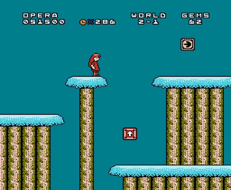 The game world features gems scattered around for Opera to collect and special bricks marked with a “S”, which when hit from below by Opera may reveal more gems or a special item. Other "secret", often invisible, bricks may contain more gems or rare items. If the player gains a heart, Opera will turn purple color. If Opera gets hit in purple color, then instead of dying she turns back to red Opera.