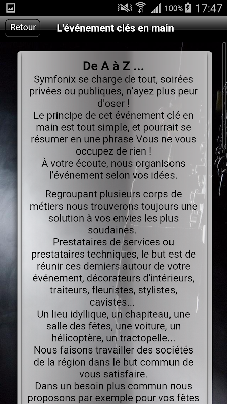 L'application "Symfonix" vous offre la possibilité de consulter toutes les infos utiles de l'agence (Tarifs, prestations, avis…) mais aussi de recevoir leurs dernières News ou Flyers sous forme de notifications Push.