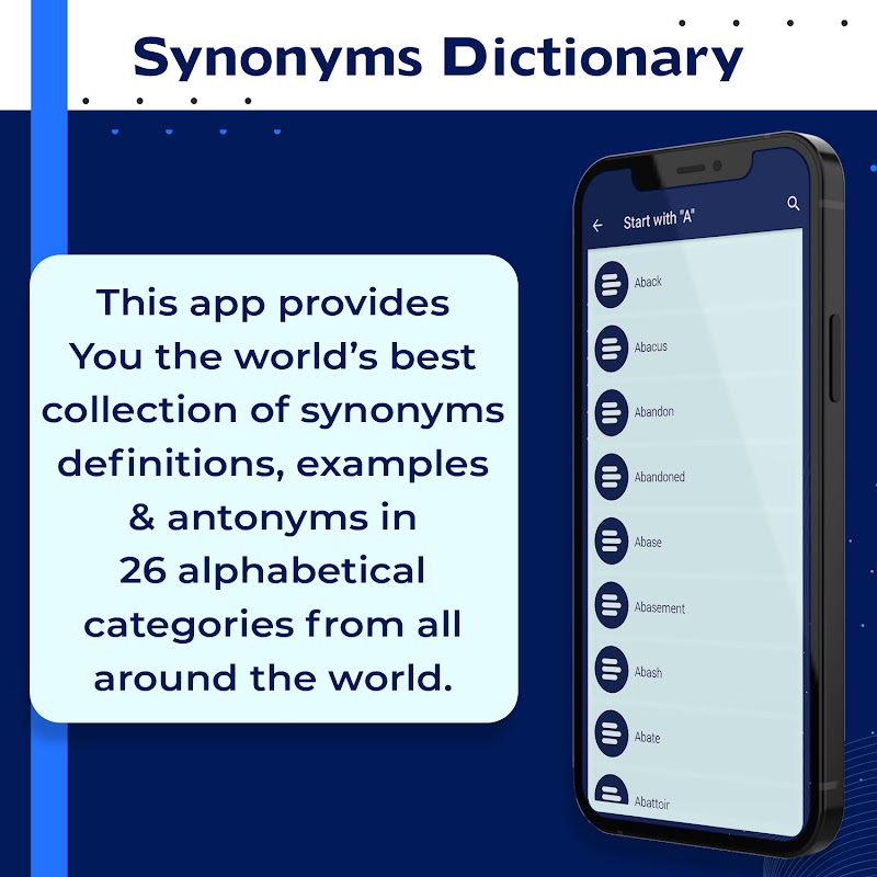 Synonyms Dictionary adalah aplikasi kamus sinonim antonim all in one bagi Anda untuk membantu Anda dalam rutinitas sehari-hari dalam mempelajari istilah sinonim baru setiap saat. Kamus Sinonim adalah aplikasi terbaik untuk berbagi istilah sinonim harian, definisi, penggunaan, dan kemungkinan antonim dengan teman dan keluarga Anda dari 12.000 antonim sinonim tepat yang disusun dalam 26 kategori abjad yang terkait dengan berbagai bidang pendidikan.