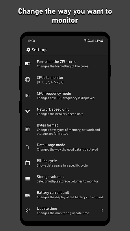 This application is a monitoring tool. Shows information about the system on the panel or in floating windows and is a useful tool for users interested in seeing how the device is behaving when running applications.