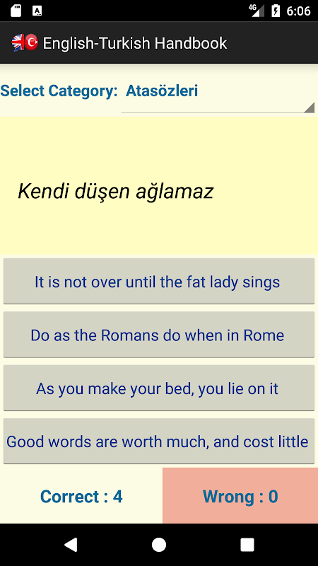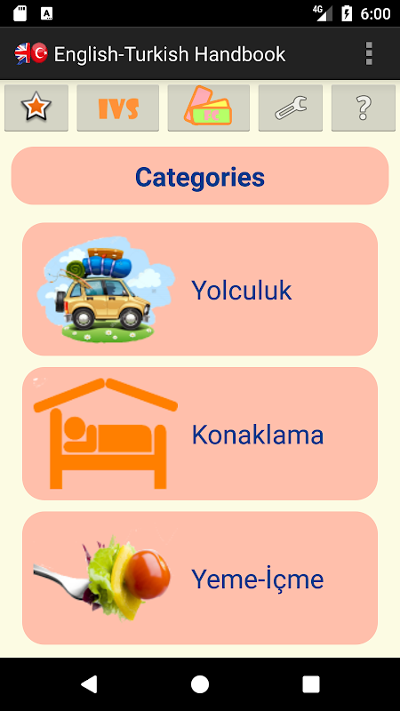 Di bawah masing-masing kategori, ada kemungkinan untuk mencari dalam bahasa Inggris dan Turki. frase kata terakhir diketik di kotak pencarian akan terdaftar. bahasa yang pencarian akan dilakukan di menu "Settings" dapat ditentukan di bawah.