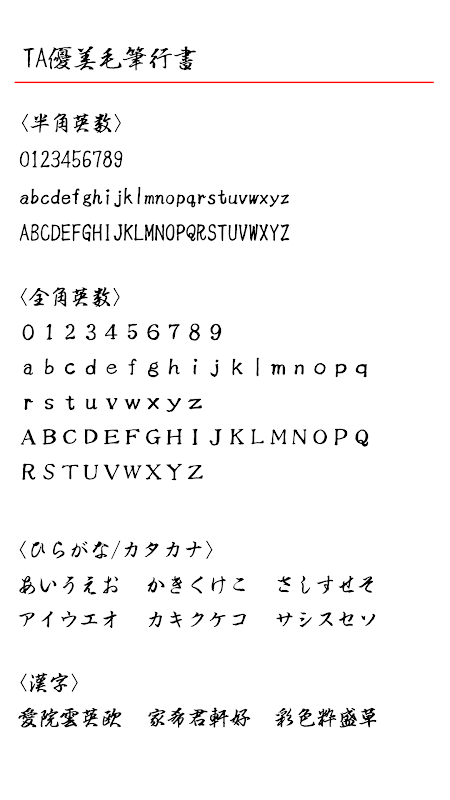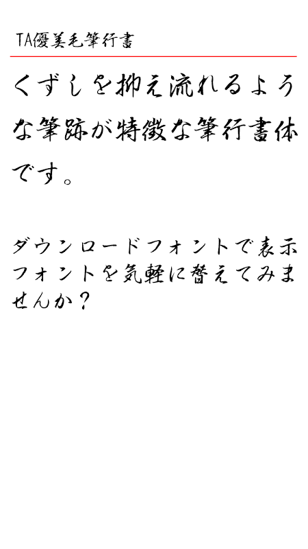 "TA Yubi Brush Gyosho" adalah font kaligrafi kuas yang telah menyesuaikan keseimbangan dan ketebalan sapuan kuas. Hal ini ditandai dengan tulisan tangan yang mengalir dan tidak menimbulkan kekacauan.