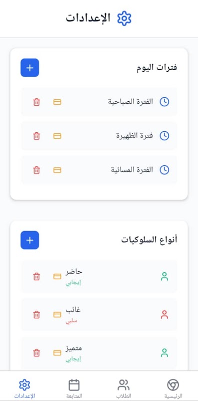 Antarmuka aplikasi berbahasa Arab dengan desain yang sederhana dan jelas, memastikan kemudahan penggunaan bagi guru dari segala usia.