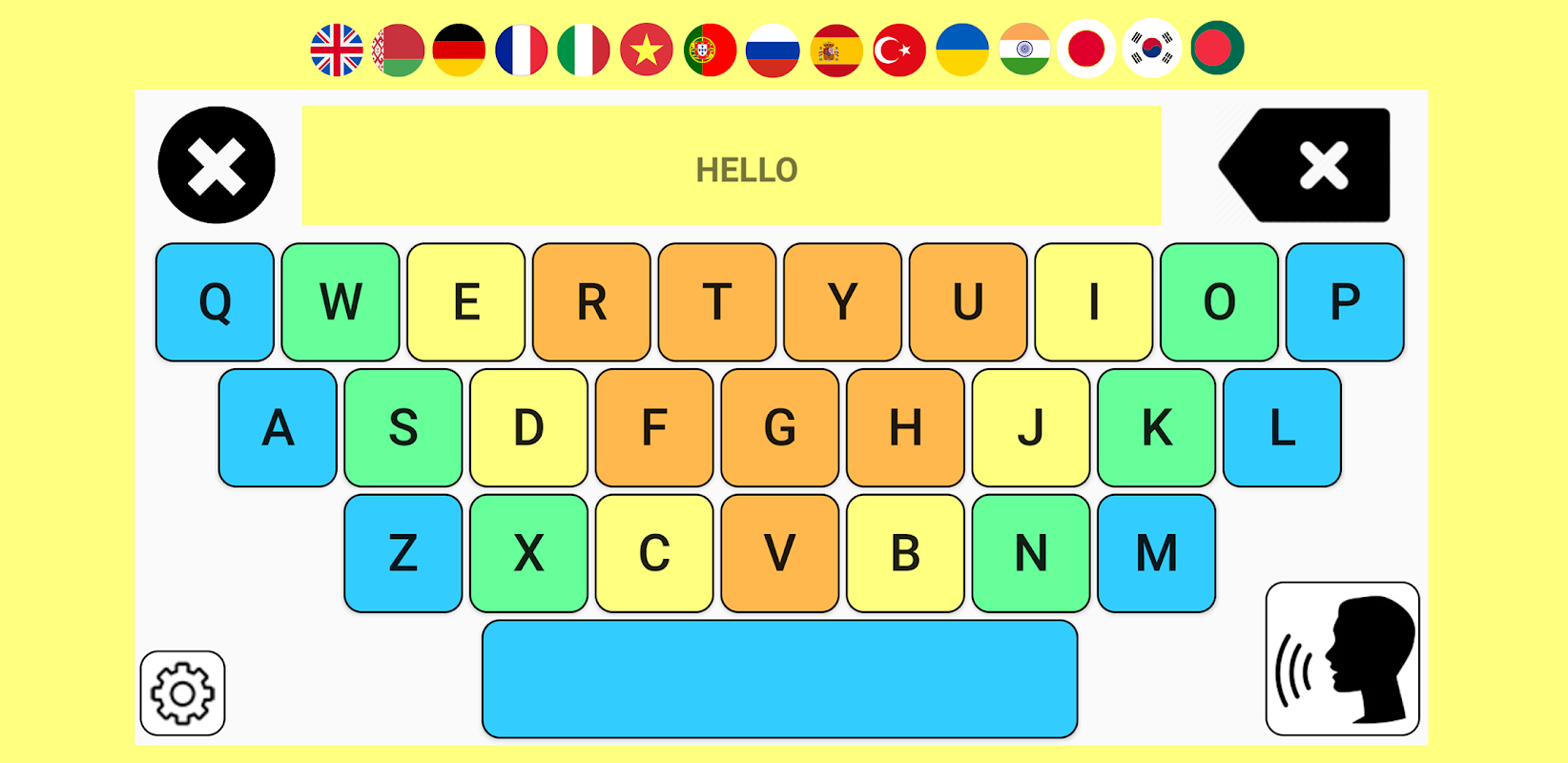 Aplikasi ini dirancang untuk penyandang disabilitas yang mulai belajar mengetik. Bahasa yang didukung: Inggris, Belarusia, Bengali, Deutsch, Prancis, Hindi, Italia, Jepang, Korea, Myanmar (Burma), Portugis, Rusia, Spanyol, Turki, Ukraina, Urdu, Vietnam. Juga, dapat digunakan sebagai perangkat AAC untuk orang-orang yang memiliki gangguan bicara, autisme atau kesulitan belajar. Tekan tombol "Text to speech" untuk mendengar kata-kata tertulis. Tekan tombol huruf untuk mendengar suaranya. Tombol dan huruf besar dan mudah dibaca.