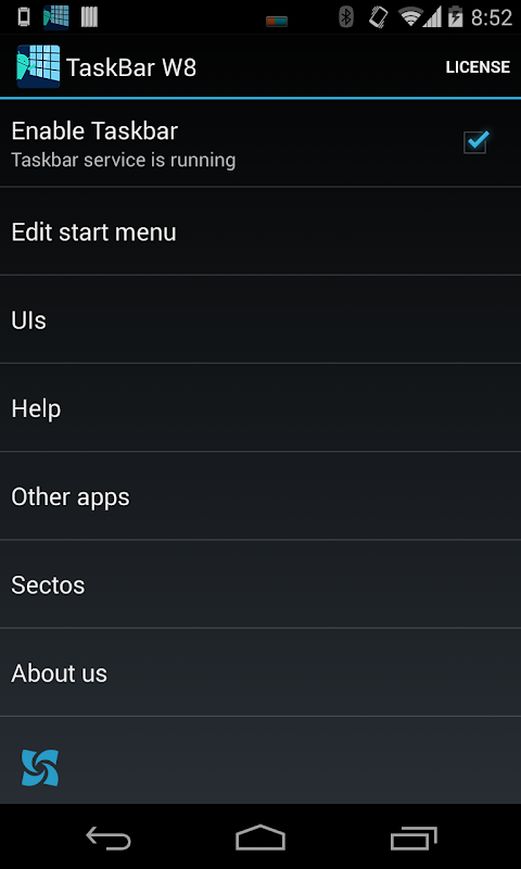 Taskbar - Window 8 style is a tool that mimics Window 8 Taskbar. It comes in handy when you want to launch apps, common settings, favorite contacts quickly.
