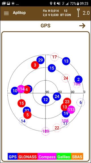 Detailed information about current position is displayed, including geographic and projected coordinates and real time graphics with the satellites constellations, including GPS, GLONASS, Galileo and BeiDou, and the Satellite Based Augmentation System (SBAS).