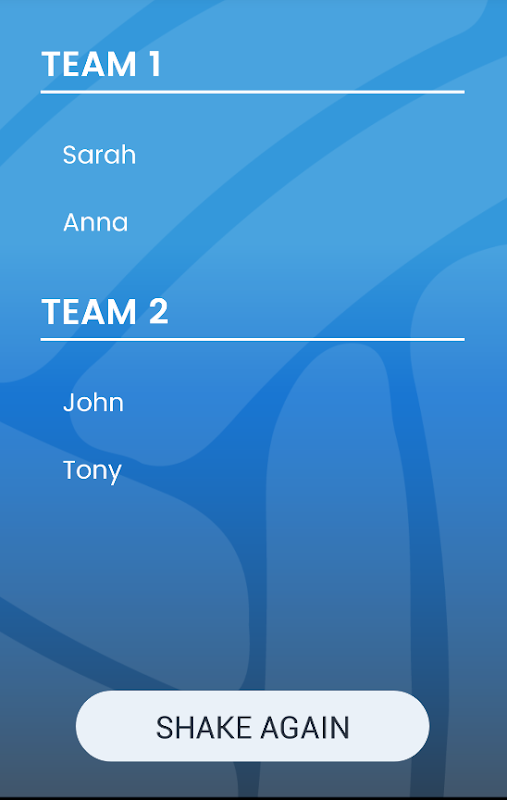 Tidak ada yang ingin menjadi brengsek dan MEMUTUSKAN siapa dengan siapa dan pada saat yang sama Anda ingin mulai bermain ASAP! Cukup gunakan Team Maker, masukkan nama teman dan SHAKE telepon untuk membuat tim!