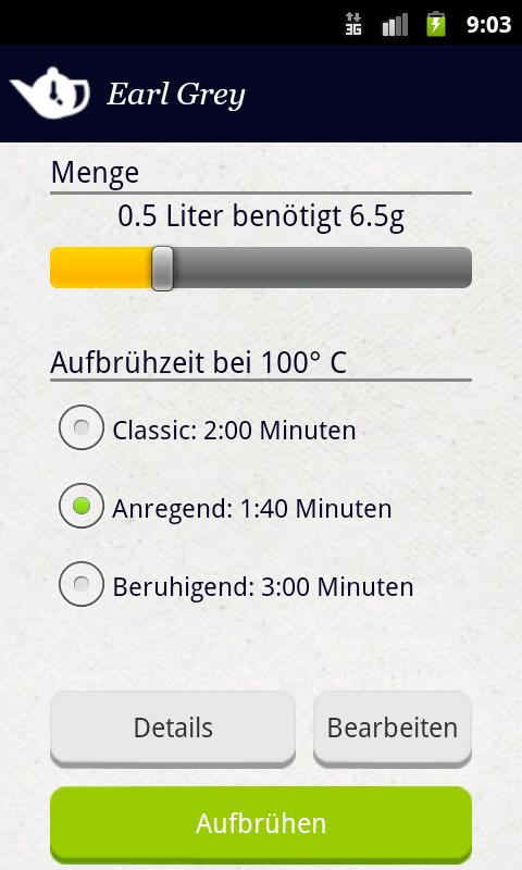 TeaTimer memungkinkan Anda memiliki cara Anda: pilih teh favorit Anda untuk akses cepat atau mengubah nilai-nilai untuk suhu, jumlah atau durasi untuk mencocokkan preferensi pribadi Anda. Anda juga dapat menambahkan teh Anda sendiri ke database.