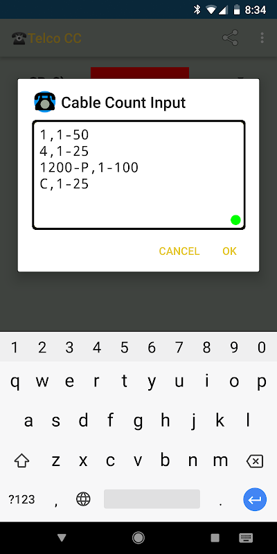While 'Count' mode is selected the input boxes allow for double space auto punctuation. So, after entering a cable name tap the spacebar twice for a comma, Then after the low count tap the spacebar again 2x for a dash. Finally after entering the high count, tap 2x more to start a new line. If the line count only has a single pair tapping the spacebar 4x will automatically bring you to a new line for input and removes the dash.