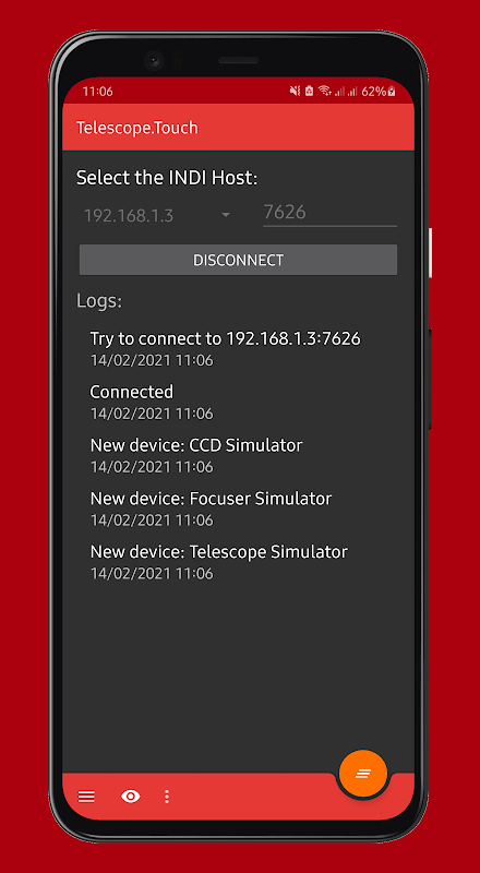 Perpustakaan INDI (lihat indilib.org) adalah perangkat lunak sumber terbuka untuk mengontrol peralatan astronomi. Aplikasi ini dapat terhubung ke server INDI untuk mengontrol peralatan Anda dari telapak tangan Anda. Itu tidak dapat mengontrol dudukan teleskop mandiri, pemfokus nirkabel atau perangkat ASCOM. Silakan merujuk ke dokumentasi INDI tentang cara mengatur server.