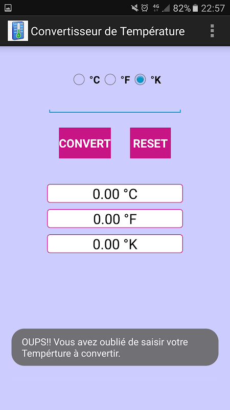 aplikasi ini menawarkan kemungkinan untuk mengkonversi suhu dari Fahrenheit (° F), Kelvin (K) dan Celsius (° C) begitu sederhana, cepat dan akurat.