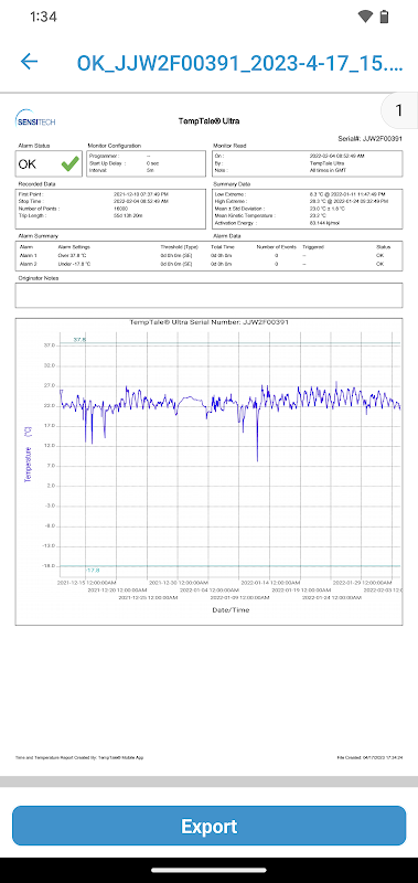 Memberikan cara mudah untuk mengunggah data ke cloud sebagai metode sekunder jika tidak ada koneksi seluler yang tersedia di tujuan akhir. “APP” akan ditampilkan pada LCD monitor. Tekan tombol start dan stop selama 3 detik. untuk mengaktifkan koneksi Bluetooth. Setelah aplikasi diinstal pada ponsel cerdas Anda, cukup buka aplikasi dan monitor Bluetooth akan menyiarkan data dalam jarak 9m atau 30 kaki (tidak perlu dipasangkan). Ketuk untuk mengunduh data suhu ke ponsel Anda. Data secara otomatis diunggah ke cloud setelah diunduh ke telepon. Ekspor file PDF atau TTV dengan cepat—kirim menggunakan opsi berbagi file ponsel cerdas Anda.