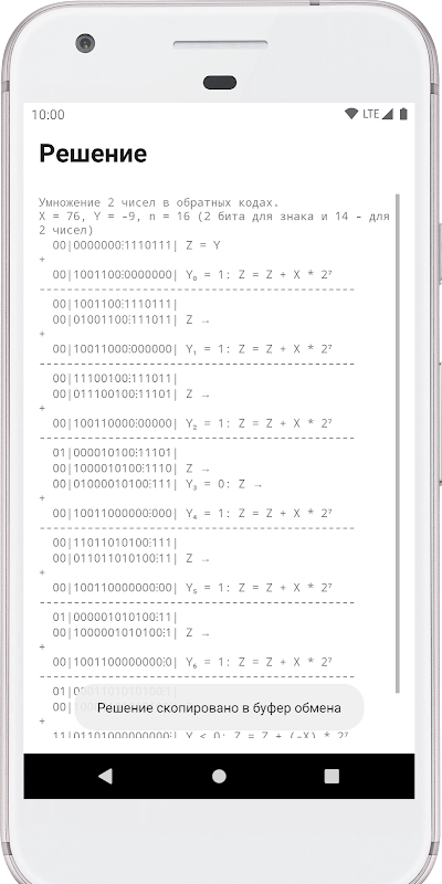 Позволяет складывать, вычитать и умножать числа в обратном и дополнительном кодах, используя модифицированный код (при умножении). Числа переводятся в двоичные, приложение осуществляет выбранную операцию и показывает решение, которым можно поделиться с друзьями.