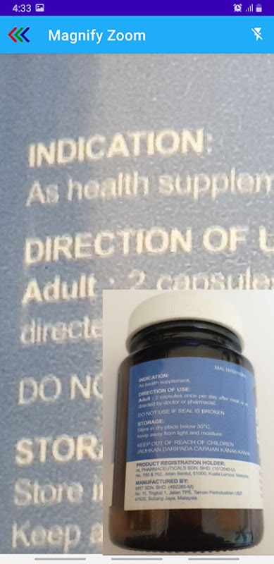 Pernahkah Anda berada dalam situasi sulit di mana Anda berada di apotek dan tidak dapat membaca teks kecil yang tercetak pada deskripsi label kotak atau botol? Atau cahaya tidak cukup untuk membiarkan Anda membaca, ini dia, penggunaan obor. Biarkan pembesar teks terbaik menangani semua pembacaan teks tercetak Anda. Cukup nyalakan kaca pembesar dan saksikan saat itu otomatis mendeteksi teks, sambil memberi Anda kemampuan untuk menyesuaikan ukuran font masuk/keluar. Bekukan teks sampai Anda membaca.