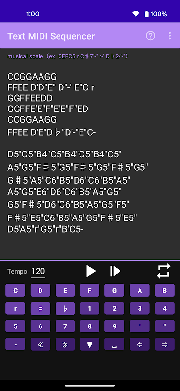 Rasakan keajaiban menciptakan musik dari teks. Saksikan momen transformatif saat ide Anda terwujud. Masukkan skala musik dengan mudah dan buat melodi yang indah. Aplikasi ini menyediakan antarmuka yang mudah digunakan di mana Anda dapat menentukan durasi aksidental, oktaf, dan nada. Untuk instruksi dan contoh mendetail, silakan merujuk ke tombol [?] di dalam aplikasi. Selain itu, kami memiliki rencana menarik untuk menambahkan lebih banyak fitur di masa mendatang, memperluas kemungkinan kreatif Anda. Unduh sekarang dan benamkan diri Anda dalam dunia sihir musik yang mempesona.