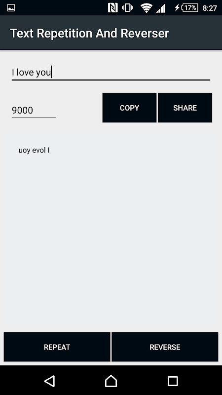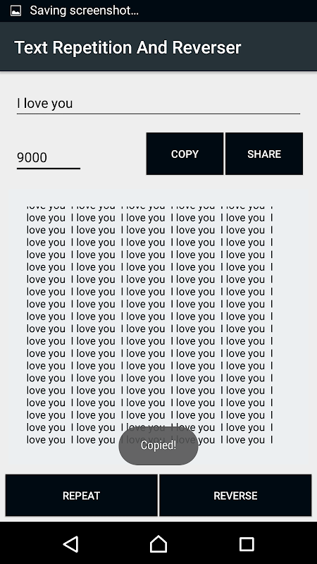 Repeat/Reverse the same text as many times as you want. Enter the number of times you want to repeat the text and click repeat, that's it! you can copy or share to yours friends by just a click. you can also find if a given number is a palindrome or not by clicking "reverse" button. By clicking on "copy" button, the whole text will be copied to your clipboard. By clicking on "share" button, the whole text can be shared to any app.