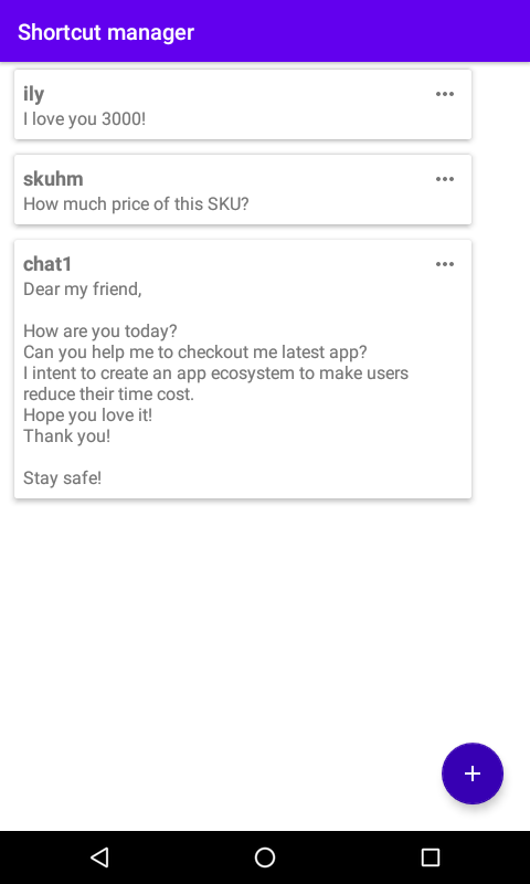 Pintasan Teks adalah alat kecil yang membantu Anda membuat pintasan teks ubahsuaian (akronim) untuk mengetik cepat, mengurangi biaya waktu.