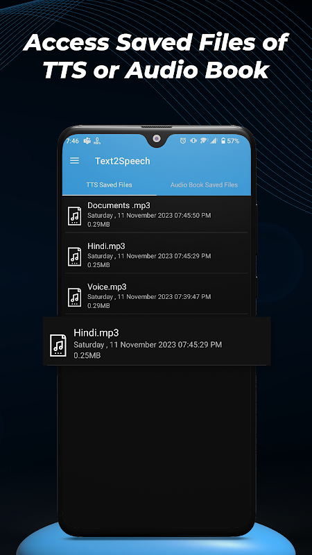 Browse saved audio converted from text using TTS or Text to speech functionalities