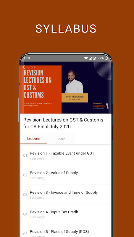 Brainery Tharun memberikan kelas berorientasi ujian dan wawasan tentang Pajak Tidak Langsung (GST & Bea Cukai) di tingkat inter dan final kursus profesional CA / CMA / CS dari fakultas ahli terkenal Prof. Tharun Raj, yang memiliki 13 tahun pengalaman dalam mengajar pajak tidak langsung selama lebih dari 10.000 siswa di seluruh India Selatan.
