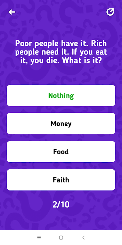 Riddle Me That is split into multiple different quizes, each containing 10 riddles. To unlock the next level you need to answer correctly 6 riddles. Answers are displayed after each question is answered.