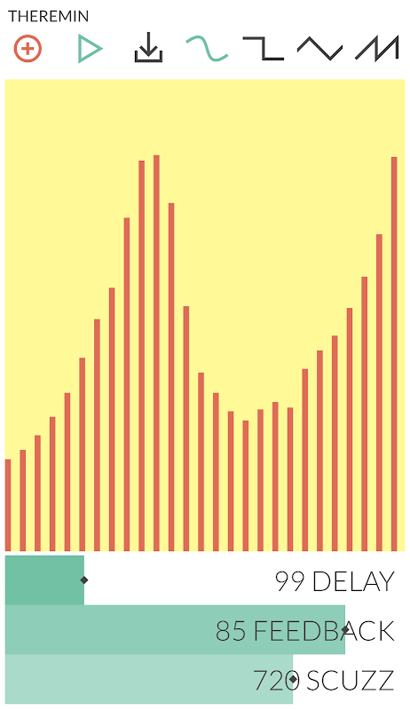Ini adalah instrumen synth multitouch. Bermain dengan menyentuh dan menggesekkan layar, mengubah bentuk gelombang dan geser efek untuk menciptakan sesuatu dari tradisional sci-fi Theremin suara untuk soundscapes scuzzy mendalam. Gunakan kontrol looper untuk merekam, lingkaran dan lapisan overdub. Kemudian jika Anda ingin menyimpan atau berbagi rekaman Anda, tekan tombol download untuk mengirim file wav ke aplikasi lain yang kompatibel seperti Pesan, Email, Dropbox dll