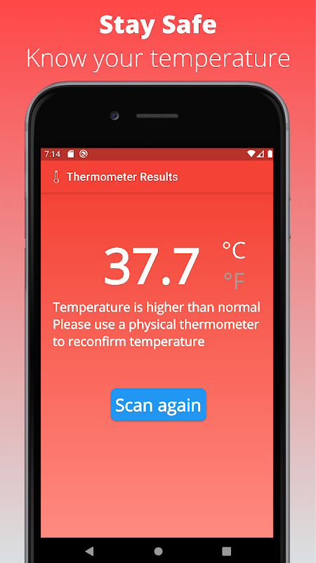 This thermometer app is perfect for the job! All the features of a forehead thermometer in the convenience of your smartphone! No need to be unsure about your current temperature anymore, just scan your temperature anywhere at your convenience today!