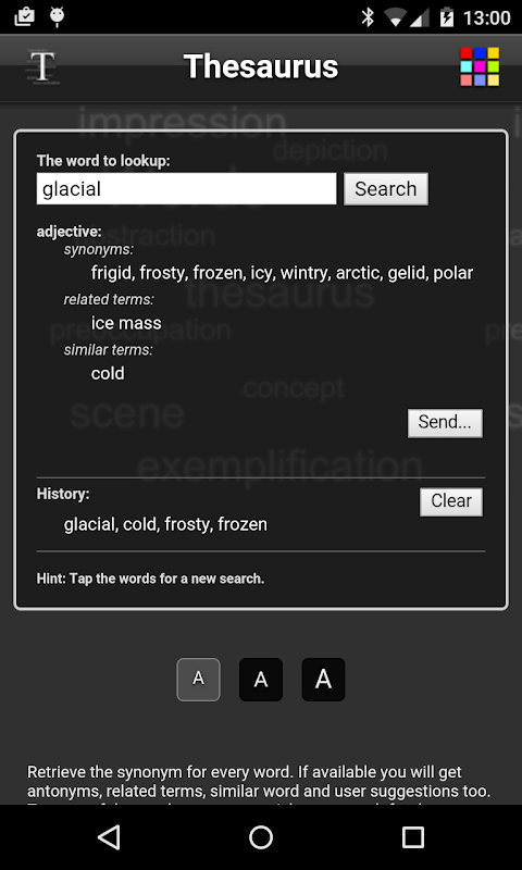 Ambil sinonim untuk setiap kata. Jika tersedia Anda akan mendapatkan antonim, istilah yang terkait, kata yang serupa dan saran pengguna juga. Tekan salah satu dari hasil untuk memulai pencarian baru cepat untuk istilah tersebut. Ini membuat daftar riwayat istilah penelusuran Anda juga.