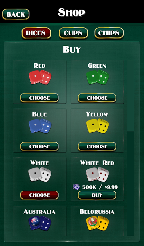 • Pembelian dadu dan cangkir yang berbeda untuk permainan. Jadilah unik, bermainlah dengan dadu dan cangkir yang tidak standar. Dapatkan chip dan pilih jenis dadu atau cangkir yang paling Anda sukai.