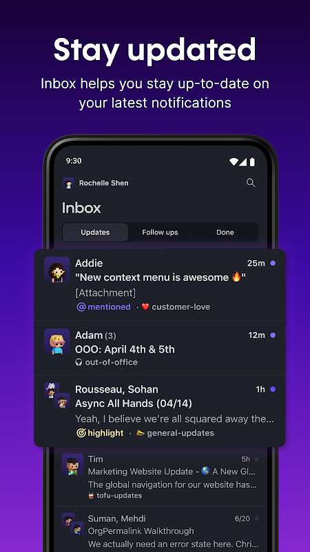 Utas seperti twitter untuk bekerja, yang mendorong pembaruan & percakapan yang menarik dan mudah dibaca, dan lebih sedikit percakapan yang tidak mungkin diikuti. Memecah pemikiran yang lebih panjang menjadi blok memungkinkan tim Anda membaca sepintas, berdiskusi, dan memutuskan waktu mereka.