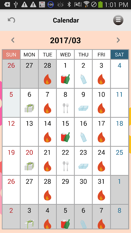 1. Sekitar Sampah Koleksi Kalender Menampilkan hari pengumpulan sampah dibakar, sampah non-dibakar, dan sampah didaur ulang