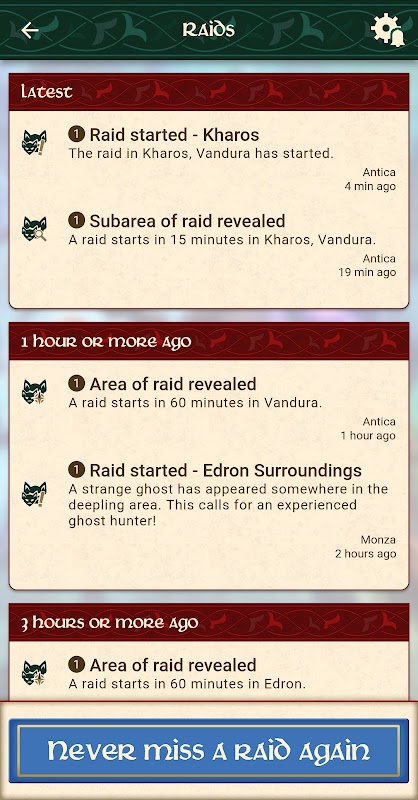 JANGAN PERNAH LEWATKAN RAID: Selalu dapatkan informasi tentang serangan yang akan datang dan yang sedang berlangsung untuk semua karakter Anda. Tentukan area yang ingin Anda lacak dan terima pemberitahuan push tepat saat aksi dimulai.