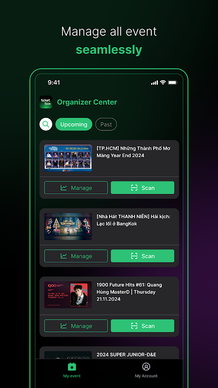 Dengan perangkat mobile Anda di tangan Anda, manajemen Checkin tidak pernah mudah. TicketBox Event Manager App dikembangkan untuk semua perangkat Android untuk membantu acara Penyelenggara cepat mengakses informasi pelanggan dan memindai semua peserta acara langsung dari kamera perangkat mobile.