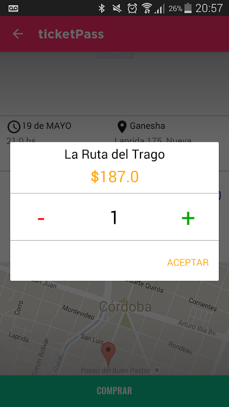 Itu super mudah, Anda login dengan Facebook, Anda memilih acara, MercadoPago digunakan untuk membayar biaya masuk dan menunjukkan kode yang disimpan di ponsel Anda untuk masuk acara.
