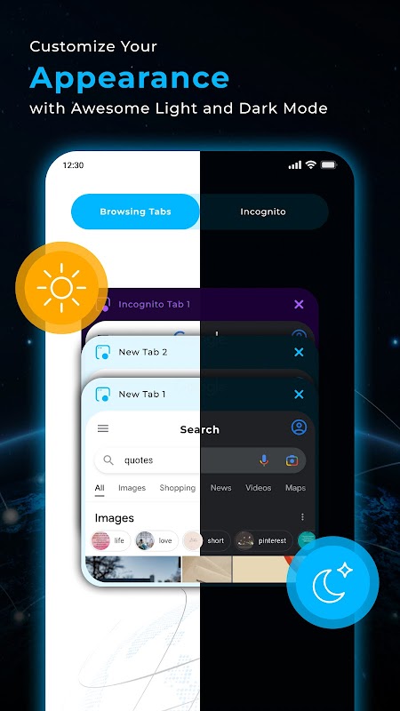 Dengan menggunakan browser TIK-TIK GO Anda dapat membuat grup dari semua tab pencarian dan dengan mudah mengakses ketuk apa pun menggunakan tab browser. Periksa dua mode berbeda dari mode terang dan mode gelap browser TIK-TIK GO. Desain intuitif yang unik menjadikannya browser yang berbeda dari browser lain. Buat daftar bookmark penting Anda untuk akses langsung ke situs itu dari situs mana pun.