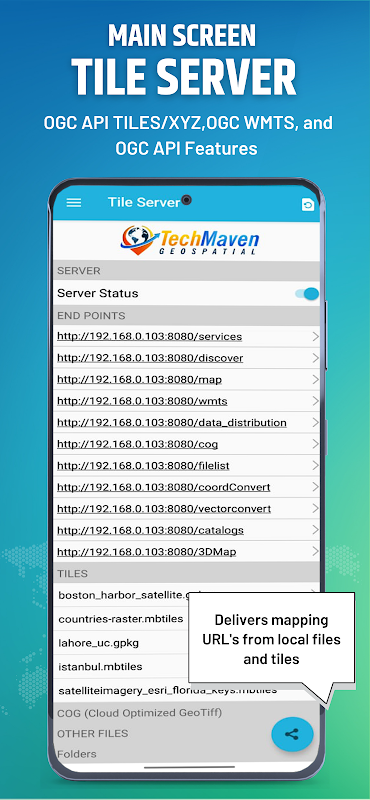 Aplikasi ini dapat menyajikan data ke aplikasi lain atau perangkat lunak pemetaan GIS desktop / laptop di jaringan. ArcMap dan ArcGIS Pro dapat mengaksesnya melalui OGC WMTS.