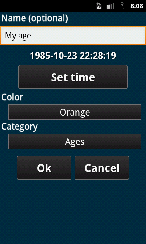 Sebuah aplikasi untuk menambah nilai waktu dan menunjukkan perbedaan waktu dibandingkan dengan waktu saat ini. Daftar di-refresh setiap detik dan Anda dapat menyaring mana kali ditunjukkan dengan menciptakan kategori. Anda dapat memberi nama kali dibuat dan menambahkan warna untuk mereka.