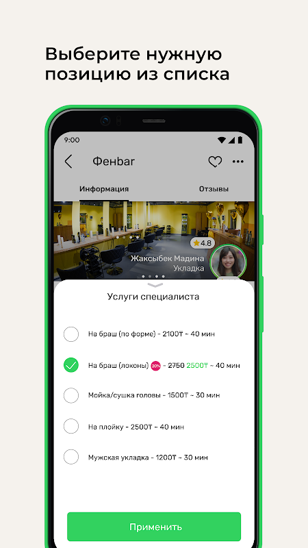 Перед каждым посещением Вы увидите имя, рейтинг, бизнес-детали, галерею, последние истории, отзывы и фотографию назначенного специалиста. Вы также сможете связаться с ним/ней, если Вам нужно.
