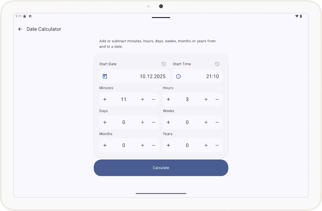 - Kalkulator Tanggal – Tambah atau kurangi hari, minggu, atau bulan dengan kesadaran zona waktu dan ringkasan durasi yang jelas.