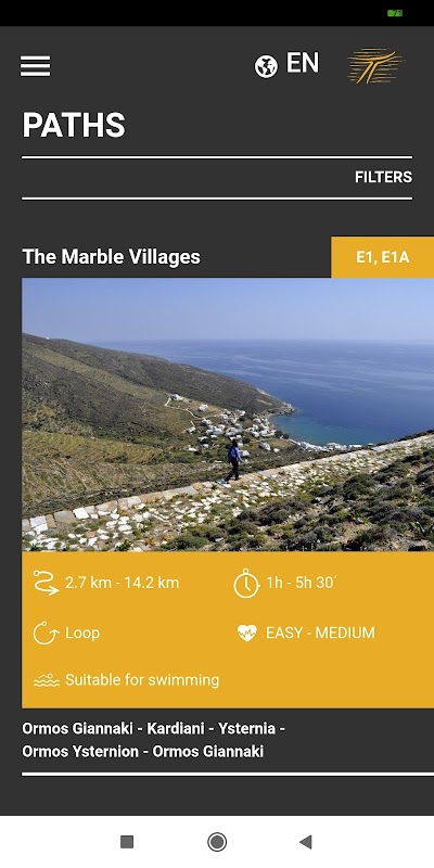Jaringan Jalur Tinos adalah program dari Kotamadya Tinos, bekerja sama erat dengan Wilayah Aegean Selatan. Cakupannya adalah untuk memberi nilai pada kekayaan alam dan budaya pulau melalui jalur keledai dan keledai tua yang dulu digunakan oleh penduduk setempat. Jaringan tersebut, mencapai sekitar 150 km, dibagi menjadi 12 rute yang mencakup sebagian besar pulau. Perencanaan jejak dan pemasangan tanda telah dilakukan oleh Jalur Perusahaan Koperasi Sosial Yunani.